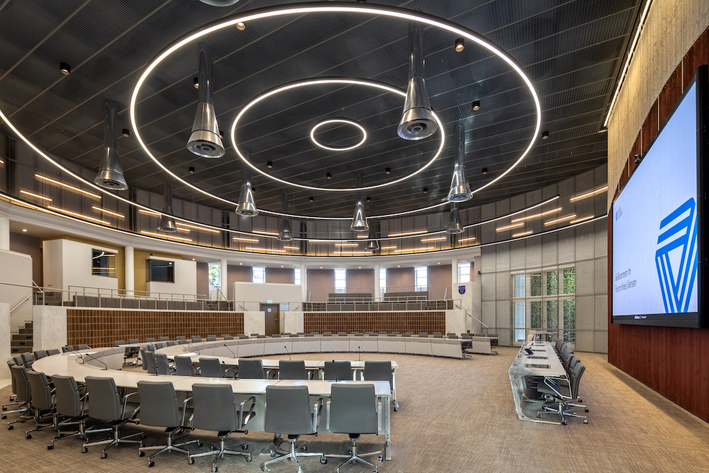 Digitale AV-Technik mit einer intelligenten Kamerasteuerung und einer großformatigen, kontrastreichen LED-Bildfläche erweitern den Sitzungsaal zu einem hybriden Kommunikationsort. Die künstlerische und architektonische Gestaltung des Saales wird in der medientechnischen Konzeption berücksichtigt.