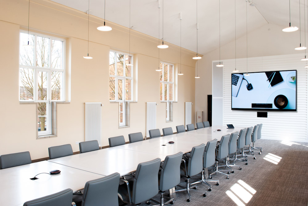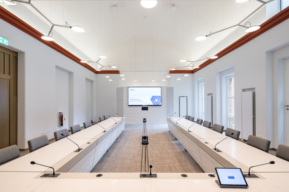 Ein konsequent hybrider Sitzungssaal. Sprechstelle und gekoppelte Kameraführung, Sowie eine kontrastreiche Bildgebung sorgen für eine hervorragende Bild- und Tonübertragung in hybriden Meetings. Ziel ist die Gleichbrechtigung aller Sitzungsteilnehmer. Intern und remote.