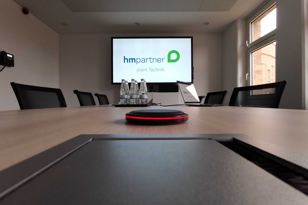 Anforderungen bewusst reduzieren. Eine eingeschränkte hybride Nutzung durch nur eine zentrale Kamera in der Front und verteilte Mikrofone auf dem Tisch. Ein Raum, im Wesentliche zur internen Nutzung.