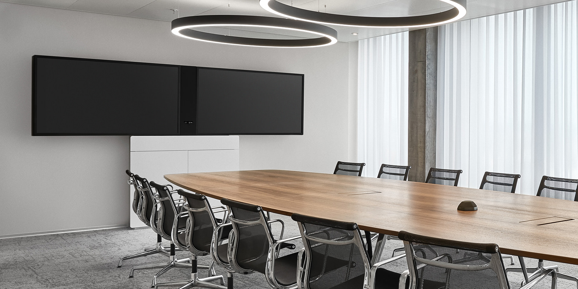 Mit zwei interaktiven Displays in jedem Raum können Präsentationen und Videokonferenzen getrennt voneinander und übersichtlich dargestellt werden. Und das mit nur vier Tasten (Ein, Aus, Wireless oder Kabelgebunden), alles Weitere läuft automatisiert ab oder wird über den Laptop des Nutzers gesteuert.